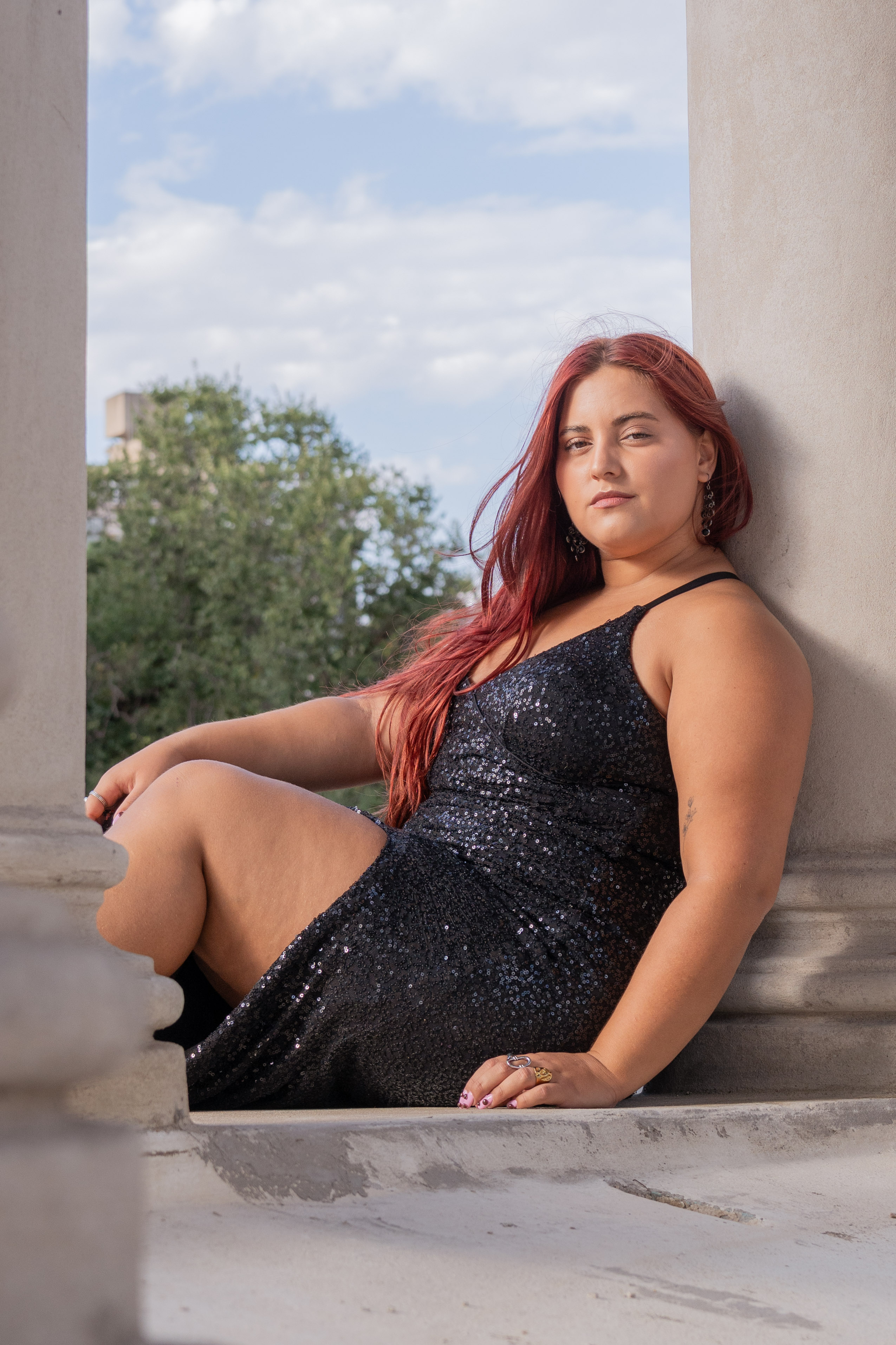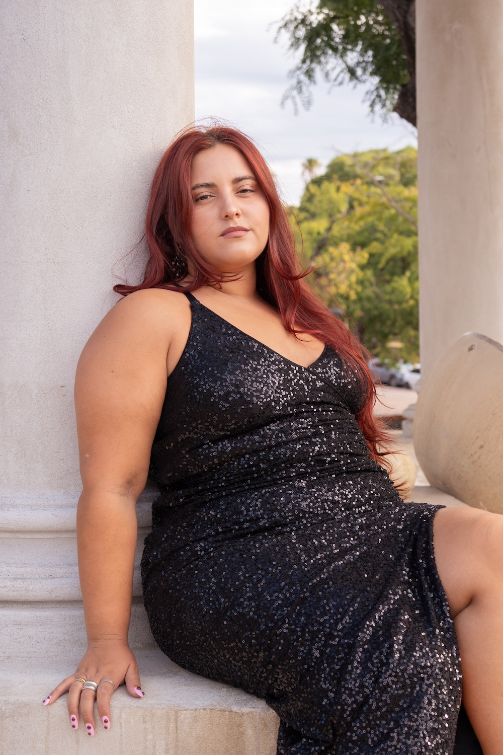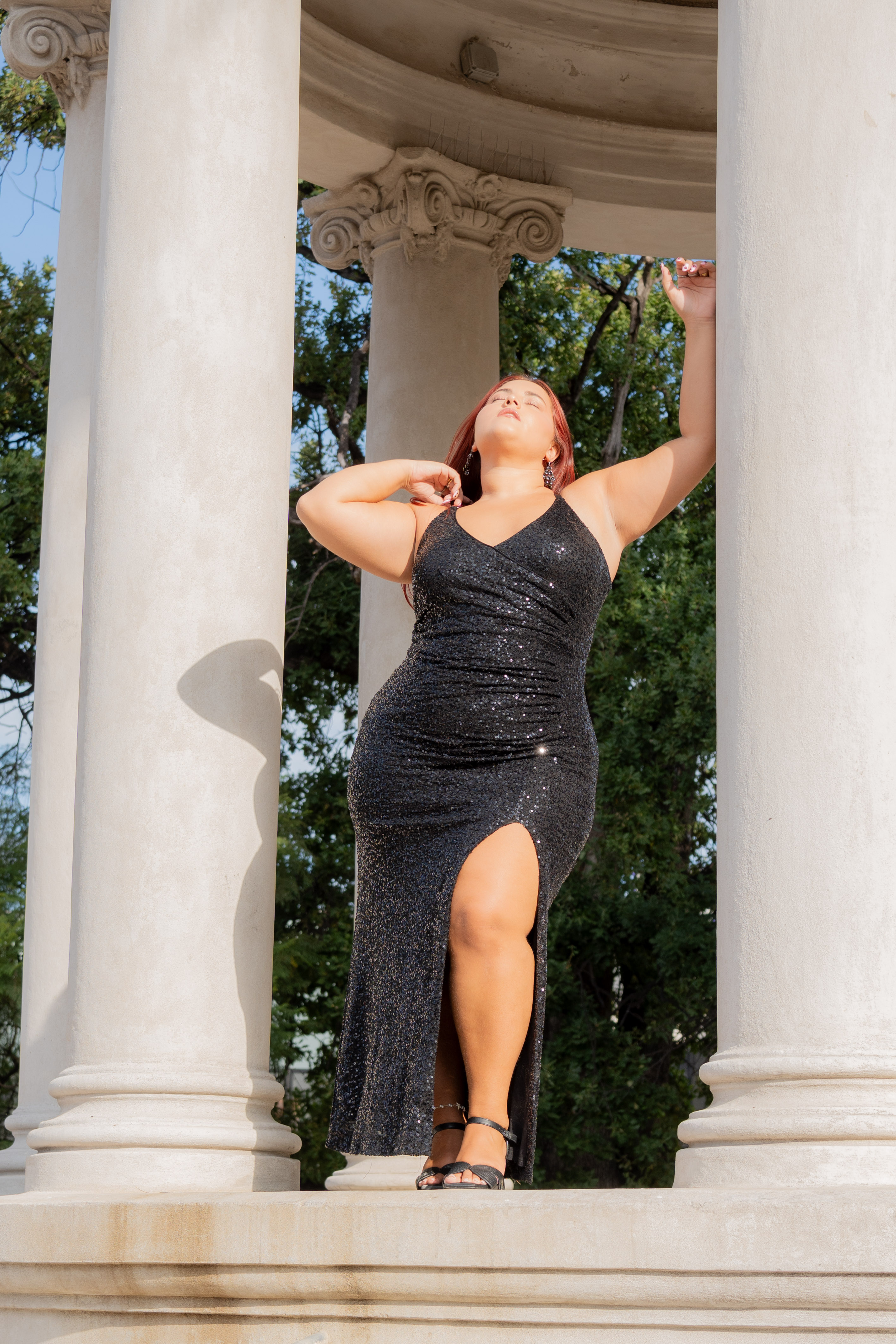 Vestido en lentejuelas con drapeados y tajo