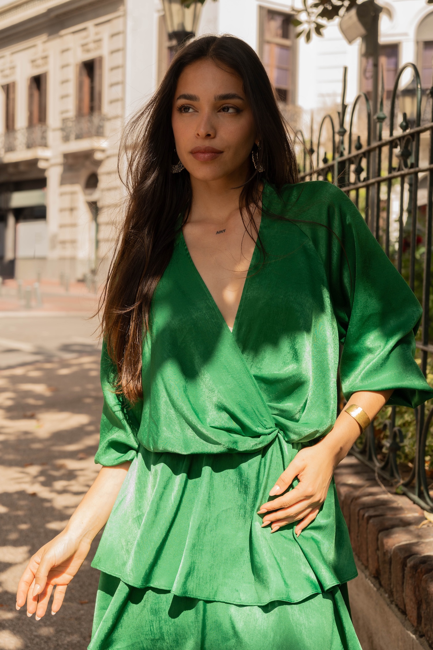 Vestido en satén verde con volados en falda